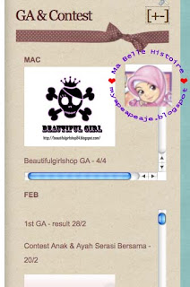 Tu dia..sikit punya panjang tajuk...agaga.. Takpela, janji maksudnya sampai kat uols..hikhik.. Tutorial ini dibuat untuk memenuhi permintaan dari kak Lela Farouk, yang inginkan banner GA & Contest macam di blog Ma Belle Conway tu.. Dan mungkin juga dapat membantu uols yang inginkan sidebar yang lebih kemas..